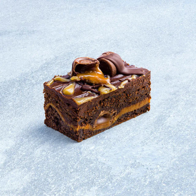 Caramel and Rolos sandwiched between glorious brownies all covered with Belgian Chocolate silk, Belgian Chocolate drizzle, caramel drizzle and more Rolos! Suitable for Vegetarian.