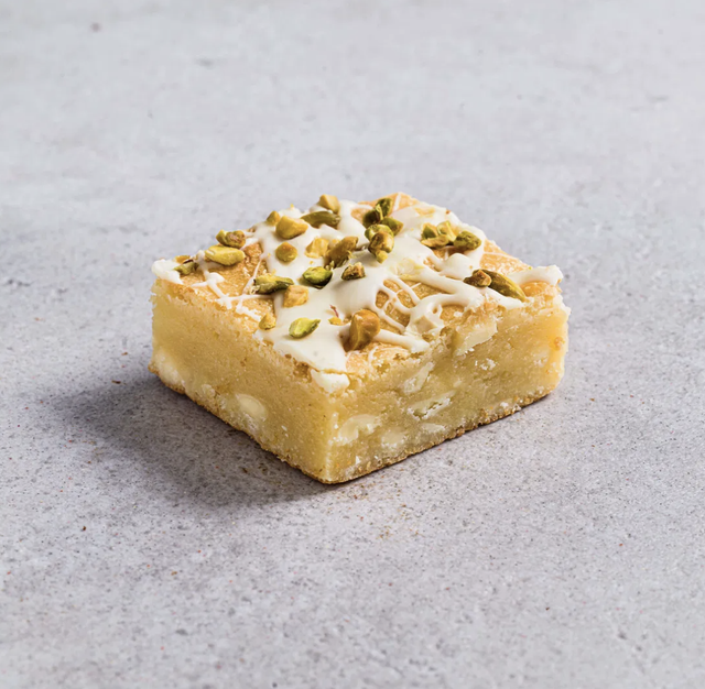 A Belgian white chocolate blondie with a centre of lemon curd, topped with a Belgian white chocolate drizzle and pistachios. Suitable for Vegetarian.